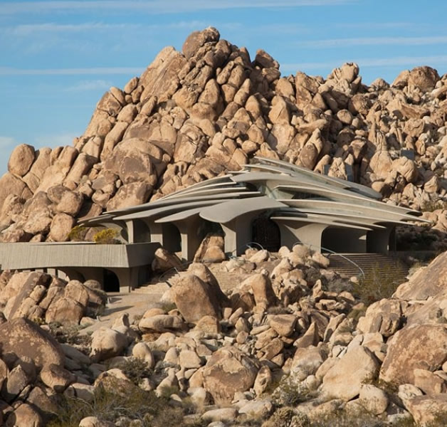 Construção moderna feita entre rochas no deserto