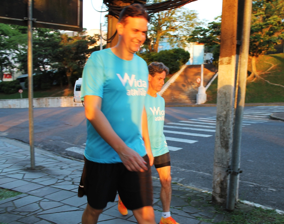 Antes de iniciar o trajeto de 4 km, com duração de aproximadamente 50 minutos, os participantes realizaram um aquecimento com um profissional de educação física.